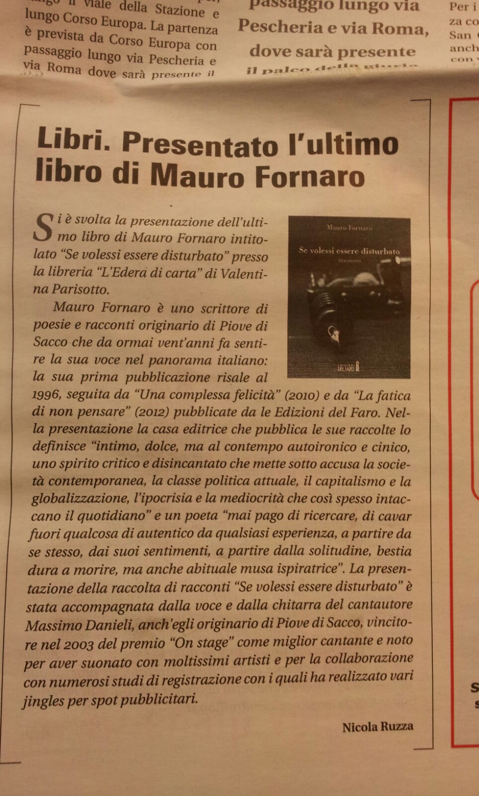 Mauro Fornaro, poeta, scrittore di racconti, romanziere, blogger e speaker radiofonico. Sempre incisivo, critico e mai schierato a priori. Perennemente in lotta con la banalità quotidiana. La sua prima pubblicazione, poetica, risale al '96, "Sottovoce". Del 2010 "Una complessa semplicità" e del 2012 "La fatica di non pensare", le altre raccolte di poesie prima di una di racconti "Se volessi essere disturbato" del 2014 e di un romanzo, uscito nel marzo del 2017: "L'uomo che piangeva in silenzio". Di ottobre del '17 è la pubblicazione poetica, la quarta raccolta di poesie, "In quanti siamo rimasti in questo caffè". Dell'aprile del 2018 è il libro di racconti "Racconti americani". Nel novembre del '19 è uscita la sua ultima raccolta di poesie, "Veramente pensate di capire i poeti?", libro estremamente autobiografico. A giugno del '21è uscito il libro "Profili pericolosi e amici imprudenti", una raccolta di racconti sempre con riferimento l'America e le sue contraddizioni. Molto attivo nel suo blog, maurofornaro.blogspot.it. Conduce una trasmissione di cultura e letteratura americana, La scrittura è una cosa seria, su Radio Bologna Centrale Web, e una rubrica di libri su Brio Radio.